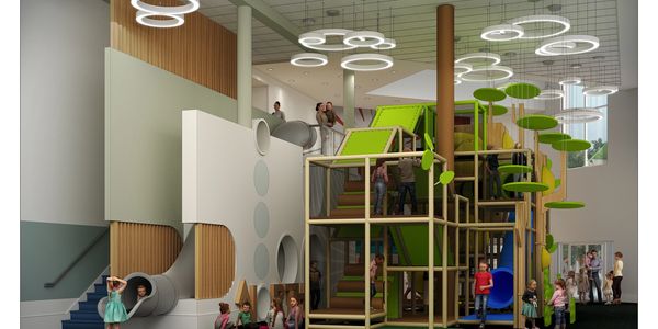 The new two-story high Lobby of the Children's Wing will house a new custom-designed tree house play structure and a giant slide from the second floor! There will be a new reception desk and kiosks for parents to check their children in during church activities.